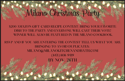 You are Invited to Milano Kitchen and Bath Annual Holiday Party! Win a $200 Amazon Gift Card in our Recipe Contest! Bring your favorite dish to the party and everyone will cast their vote! Winner will be featured in the Milano Cookbook! RSVP by November 28. If you are entering the contest, tell us what you are bringing to avoid duplicates.
